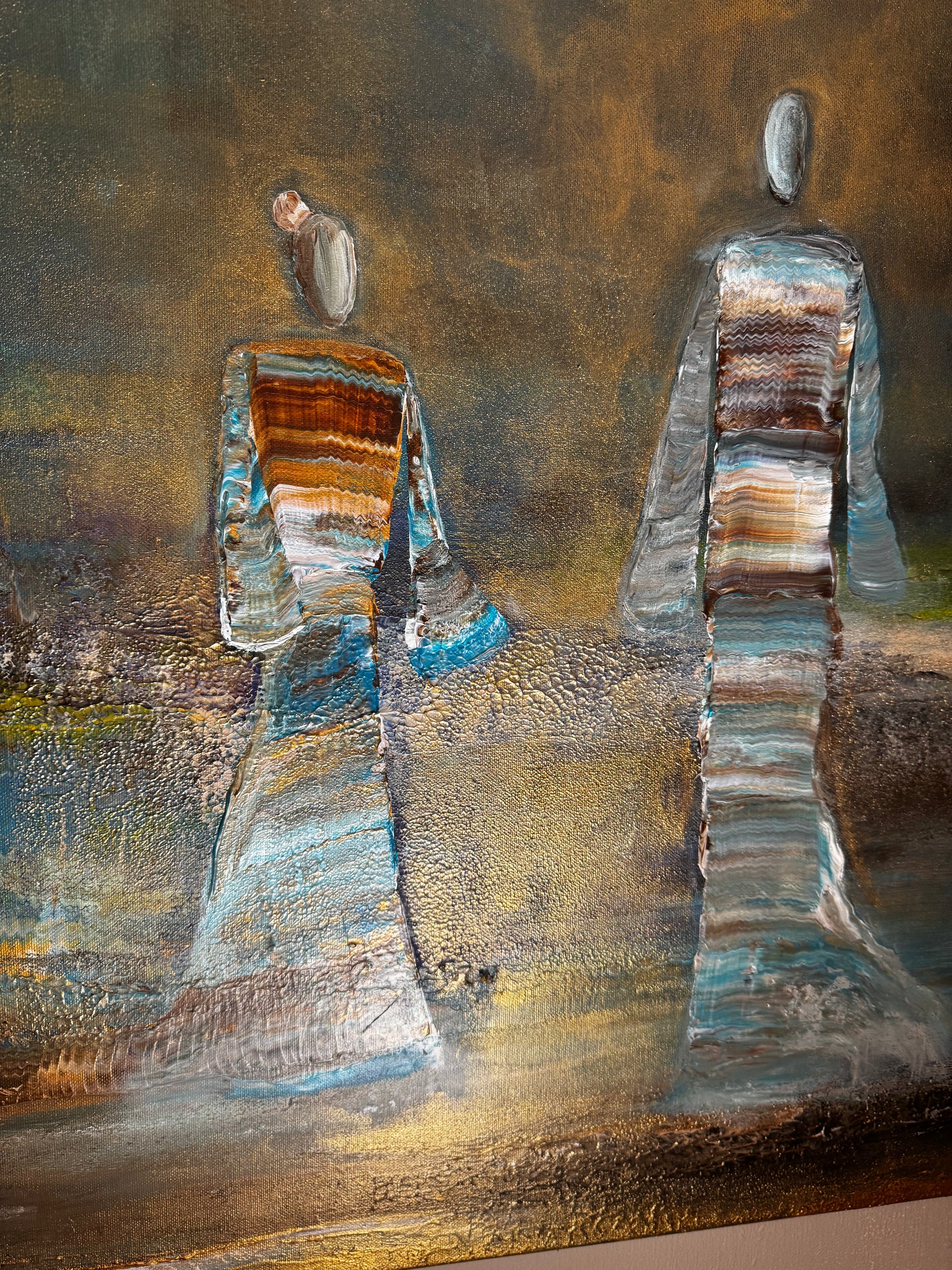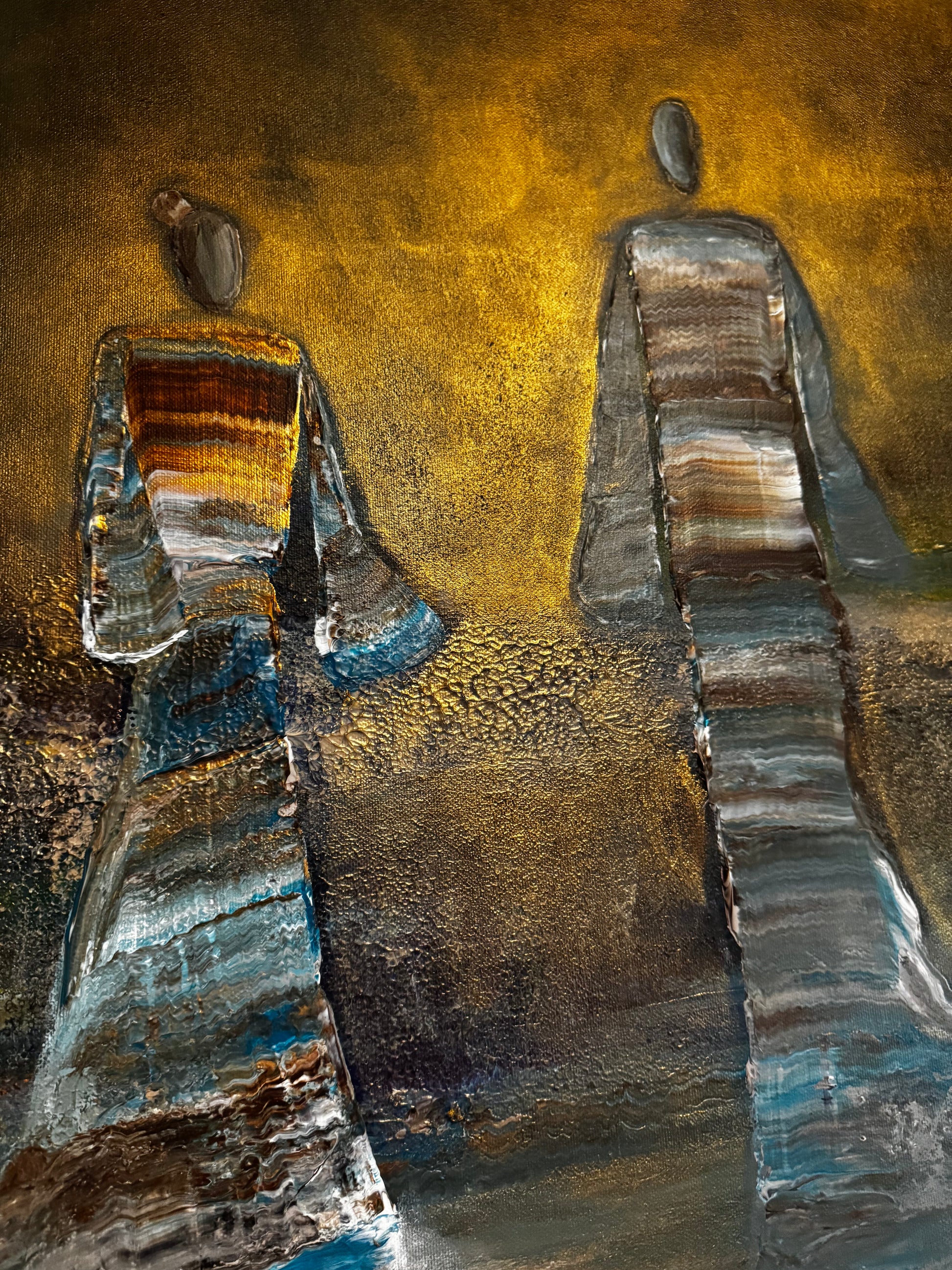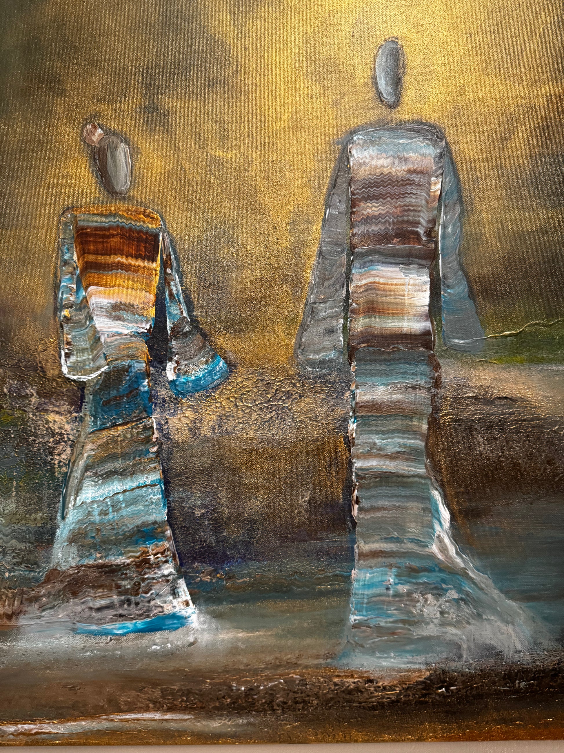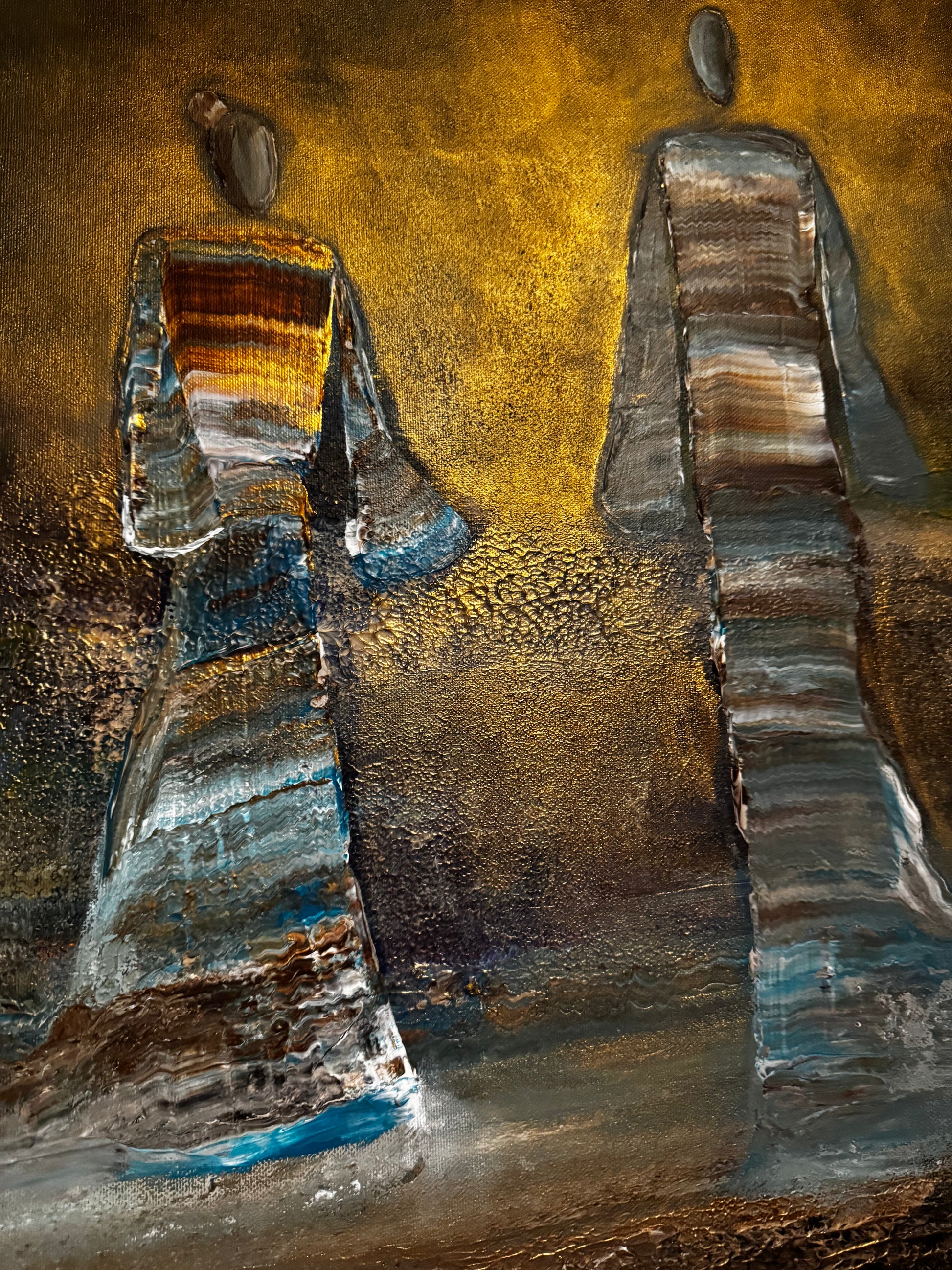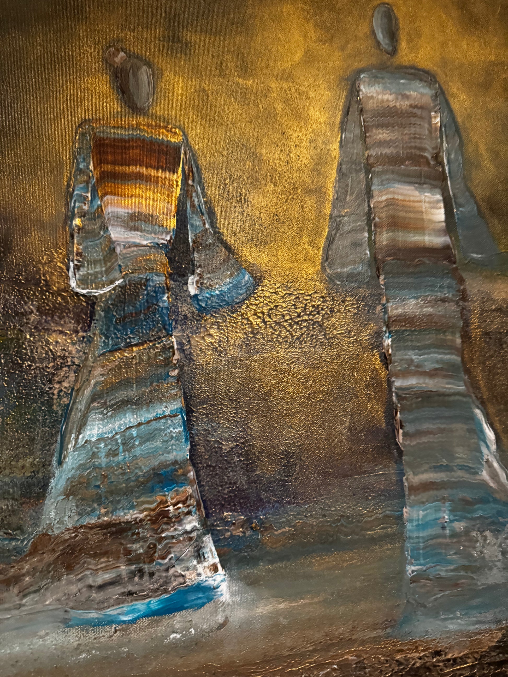 Two figures walk into the light, a quiet moment between time and infinity. Surrounded by soft tones of gold and blue, they seem to move beyond what is seen, carrying a sense of peace, connection, and timeless presence.