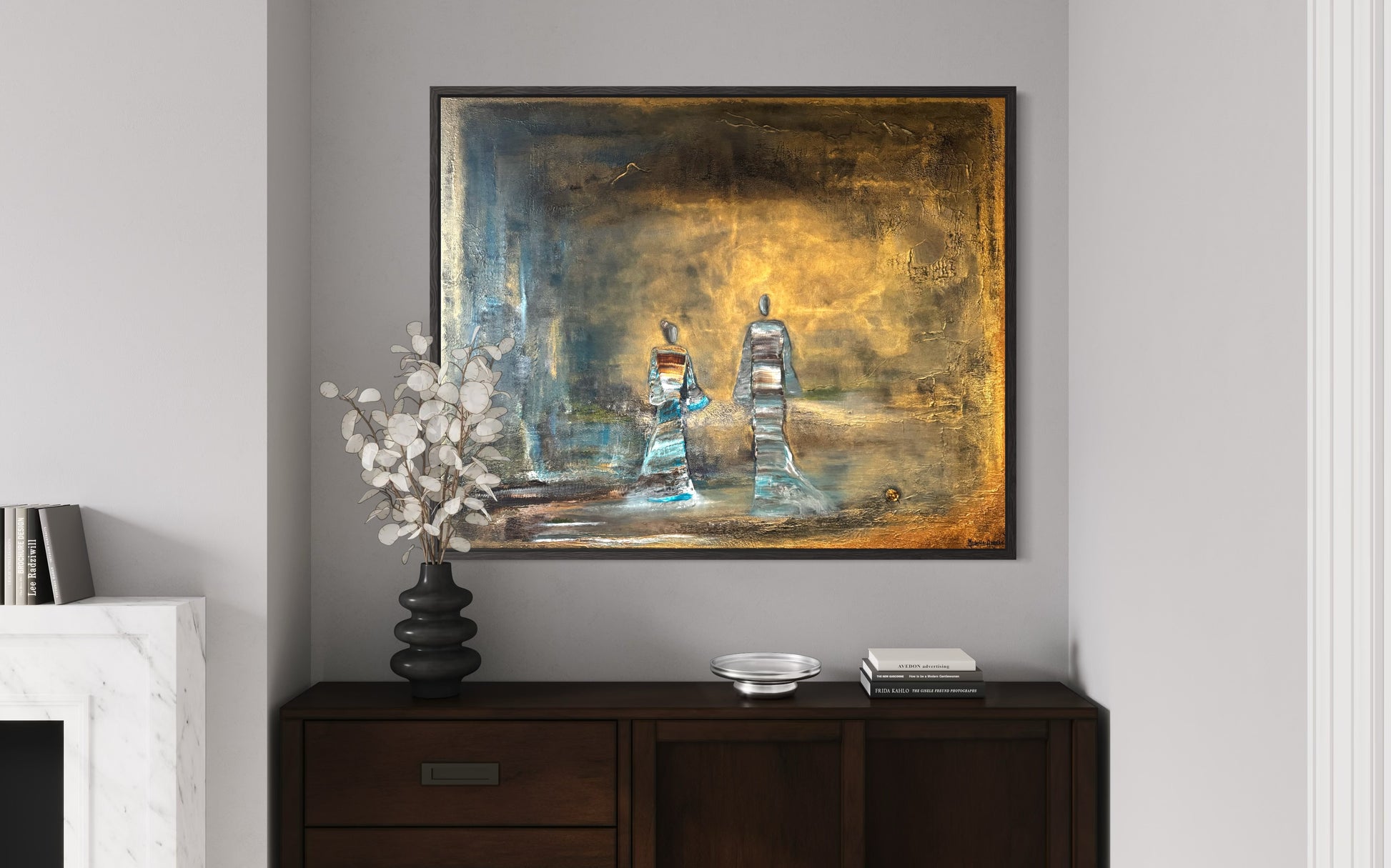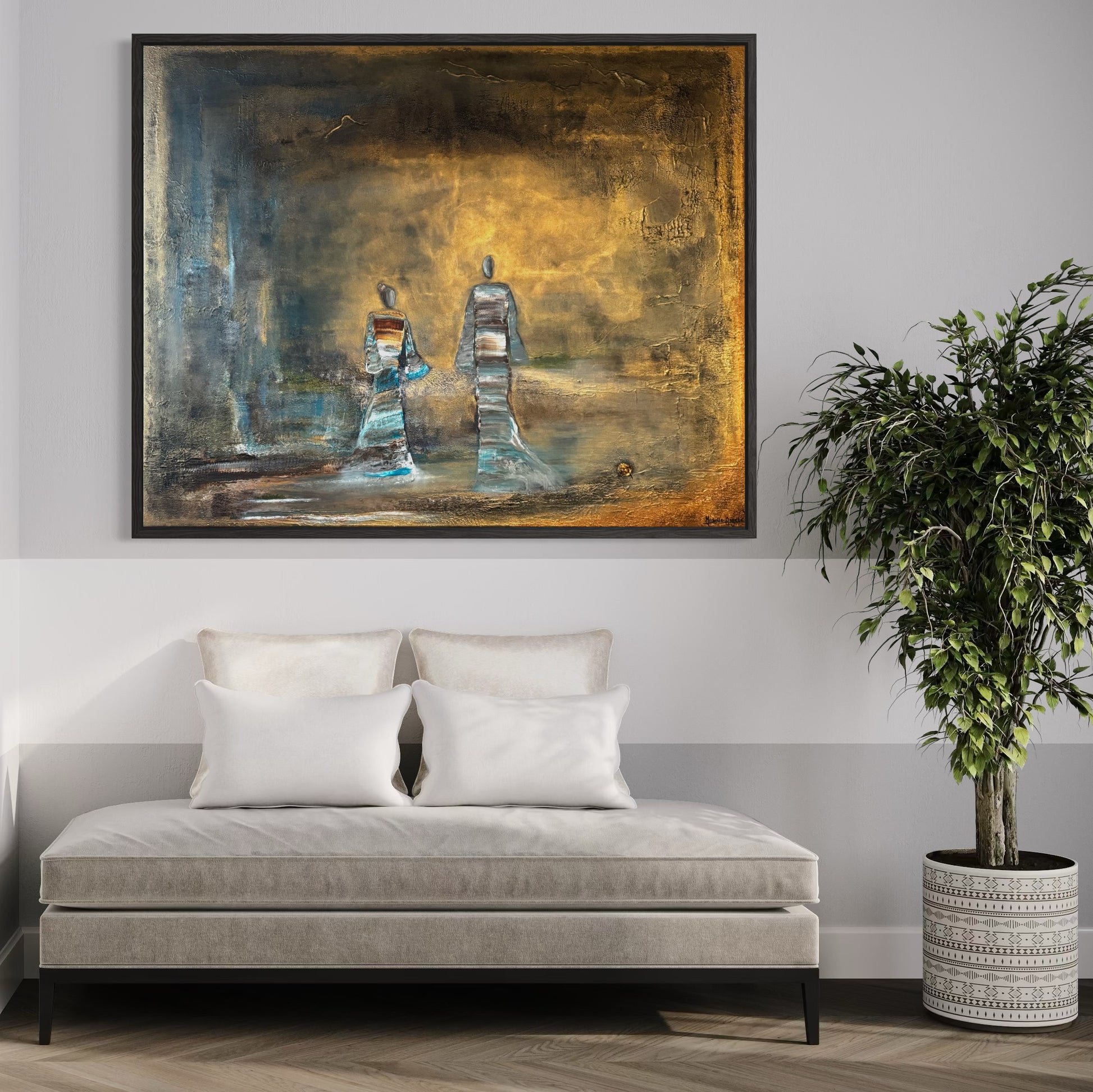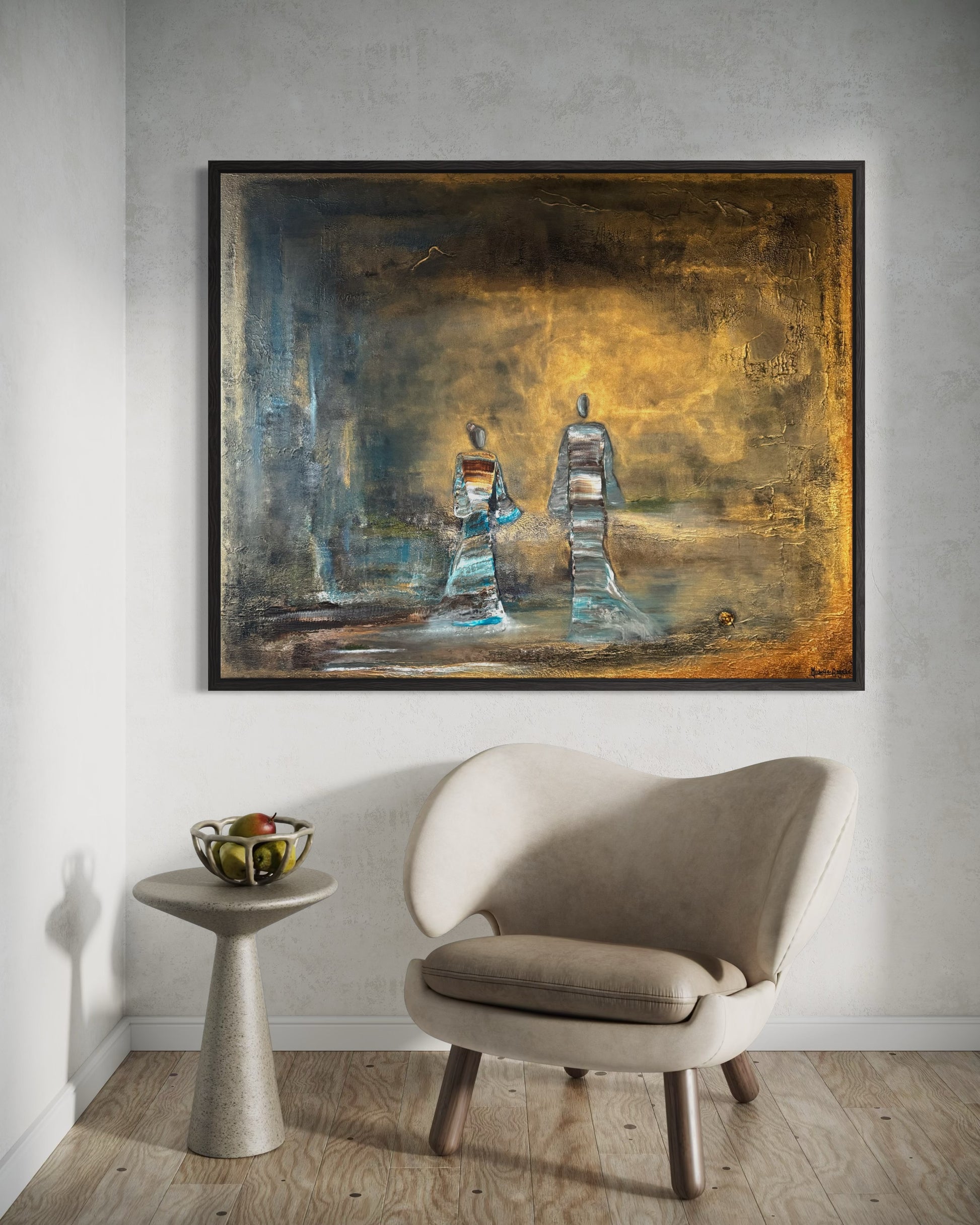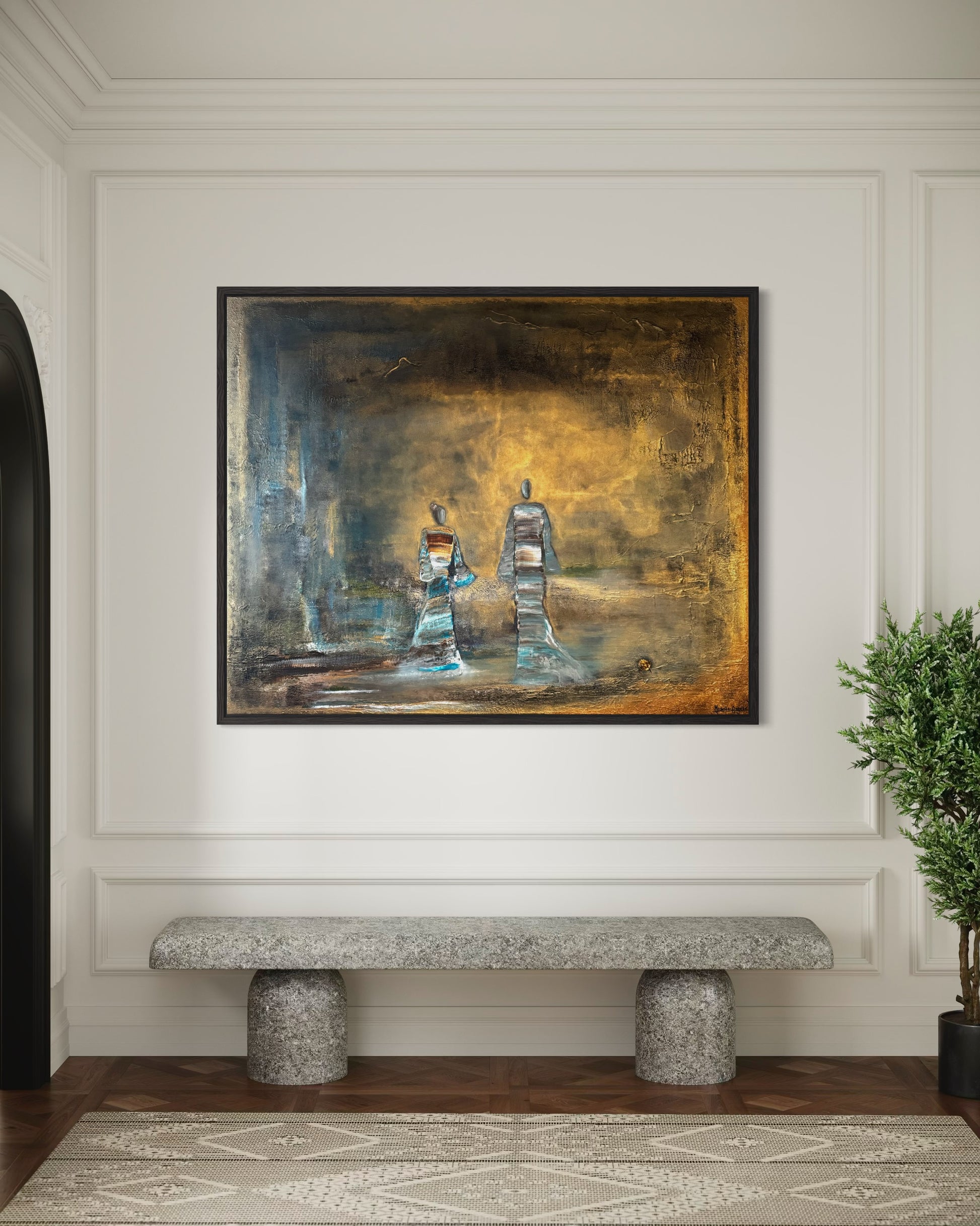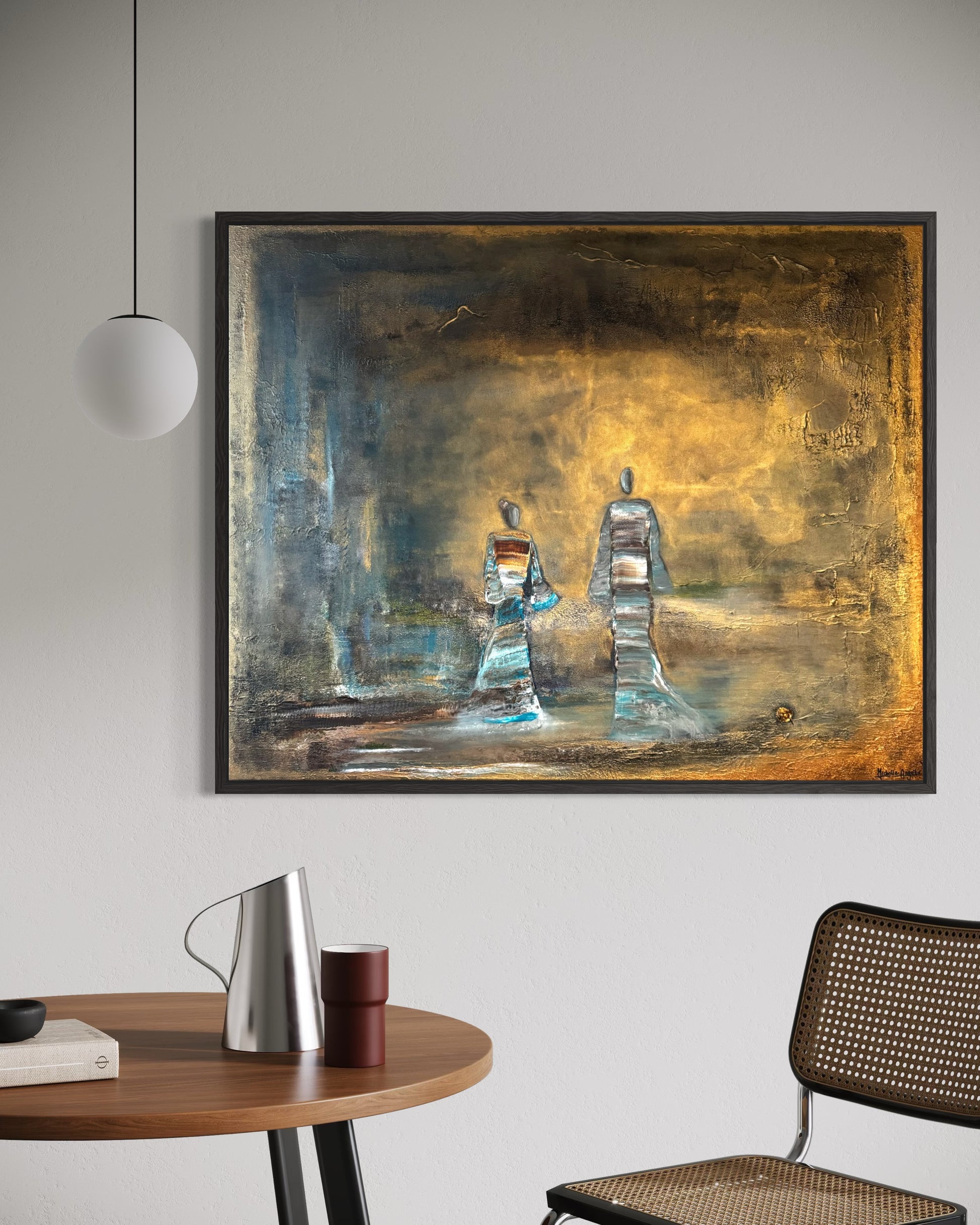 Two figures walk into the light, a quiet moment between time and infinity. Surrounded by soft tones of gold and blue, they seem to move beyond what is seen, carrying a sense of peace, connection, and timeless presence.