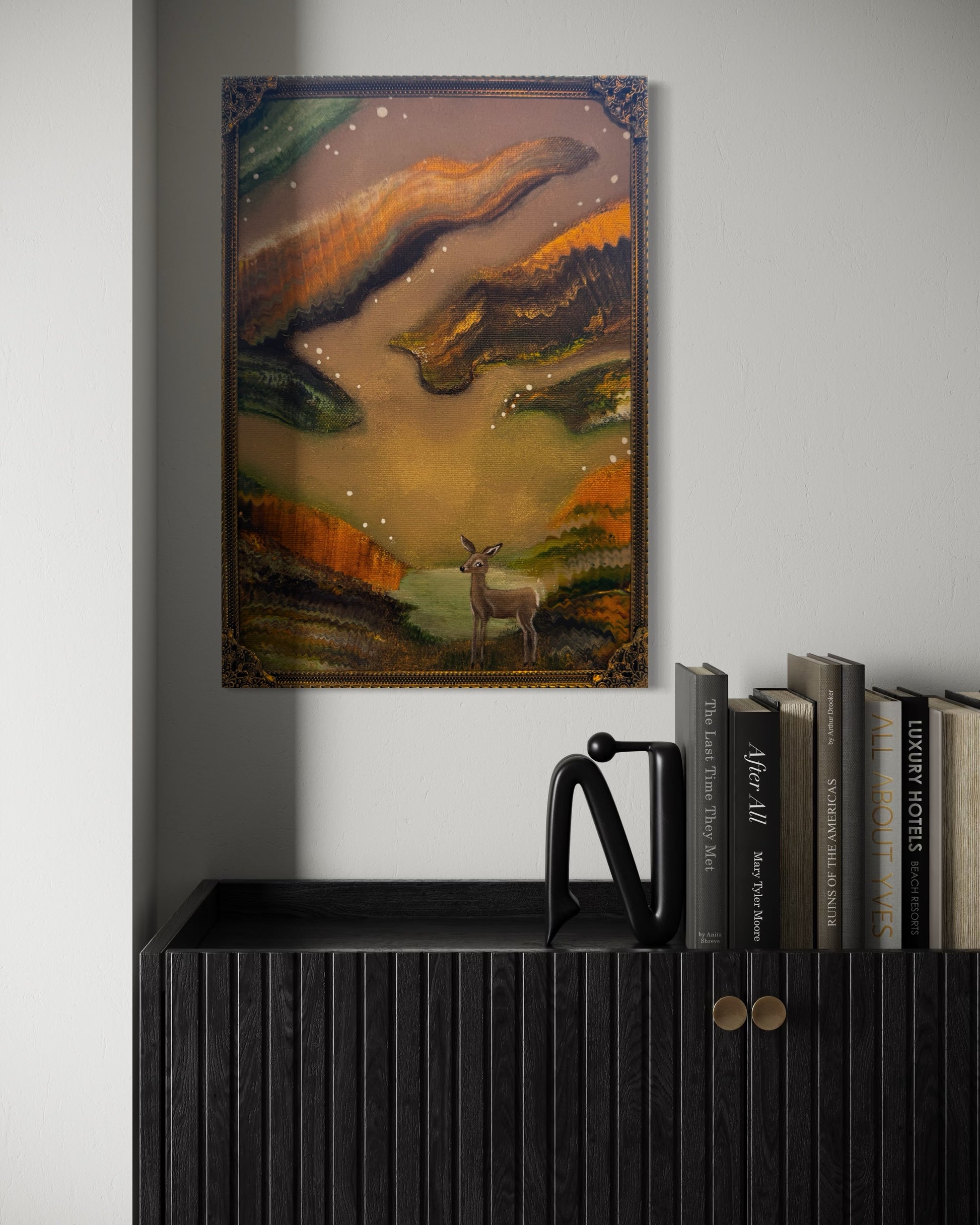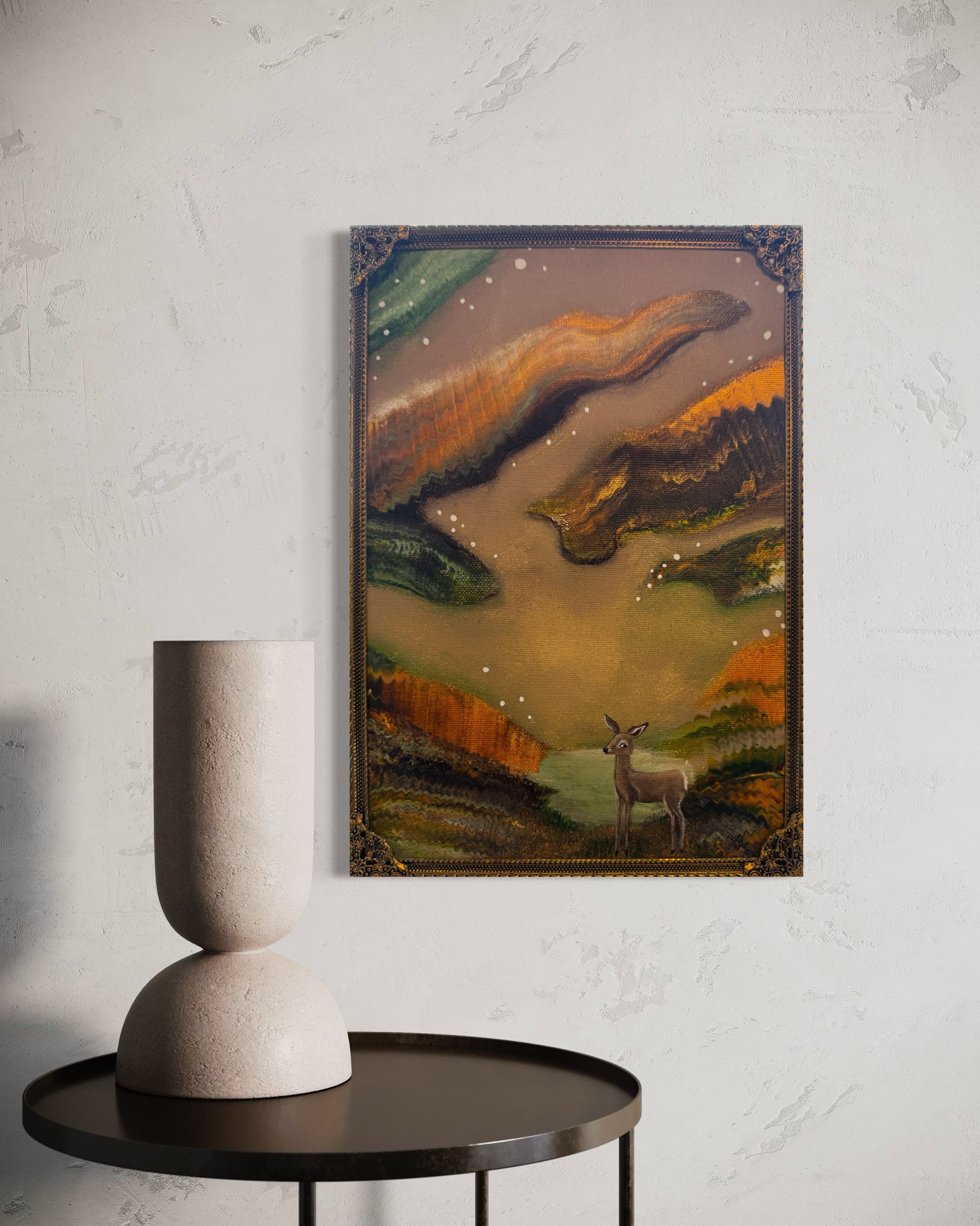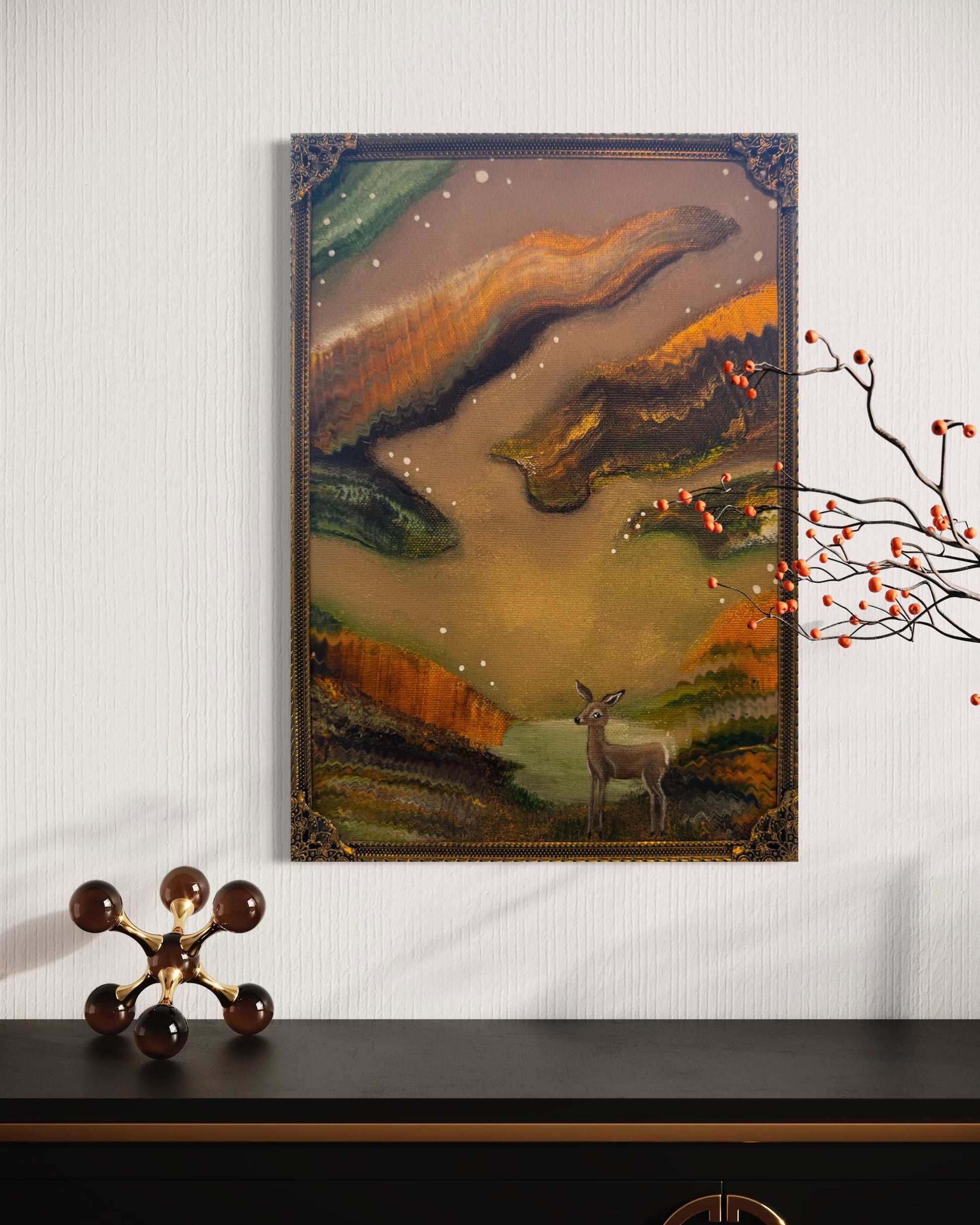 Small original art piece in vintage frame. This is inspired by nature and its way of making spirit feel the calm of a quiet night.