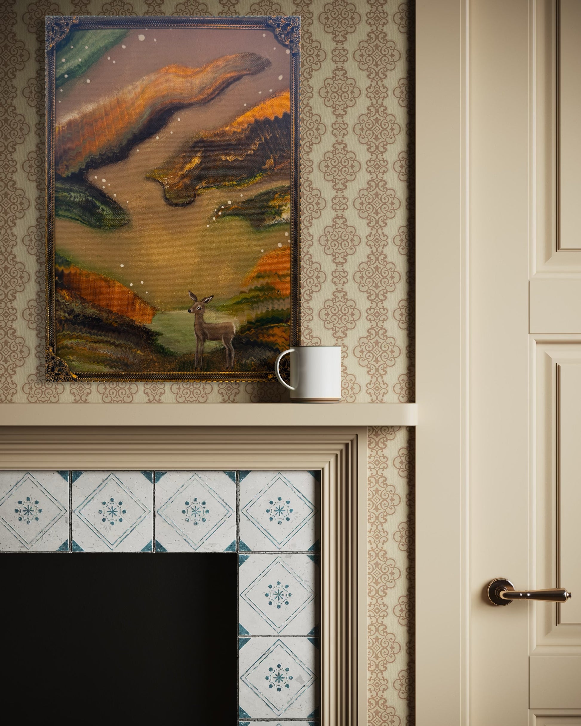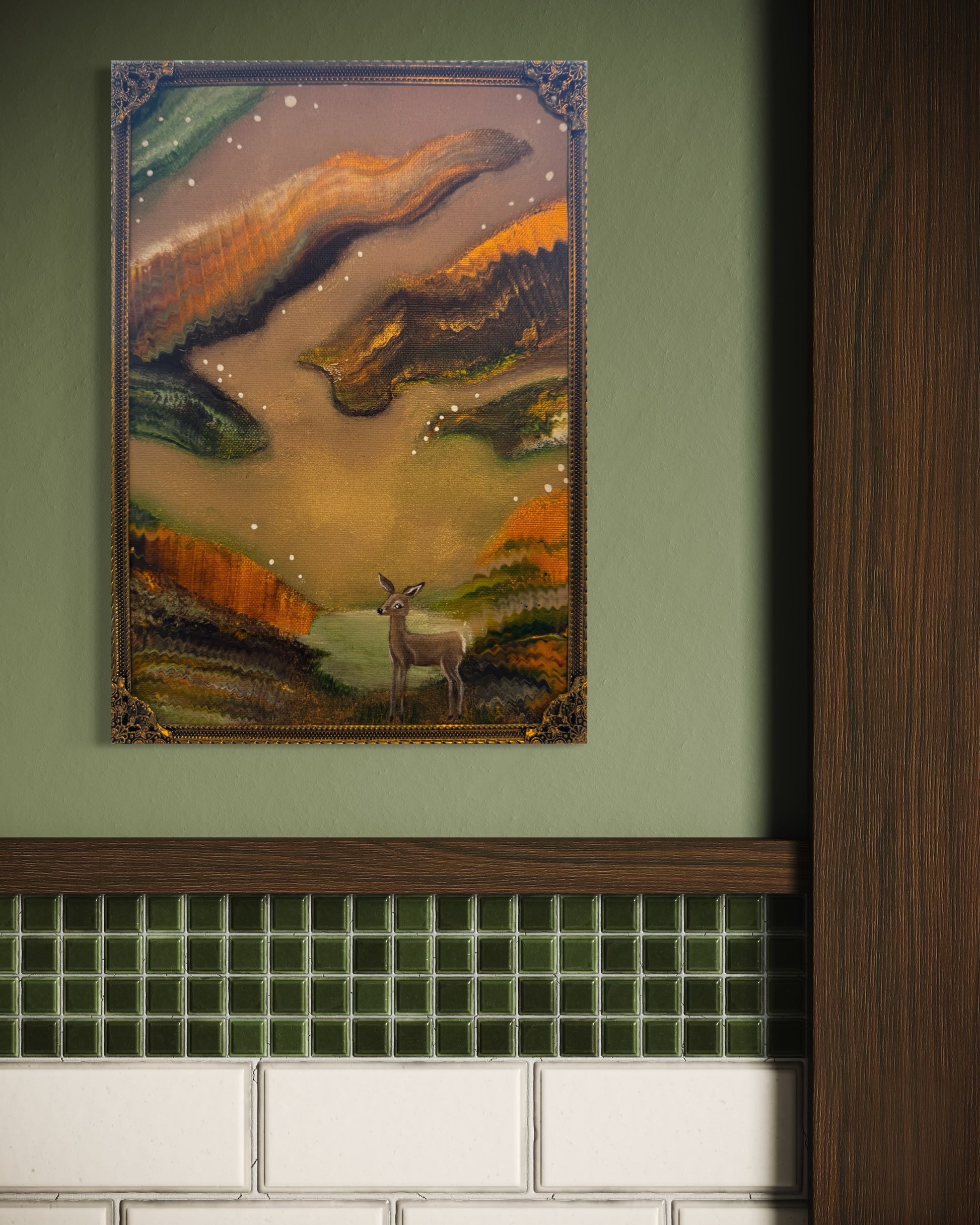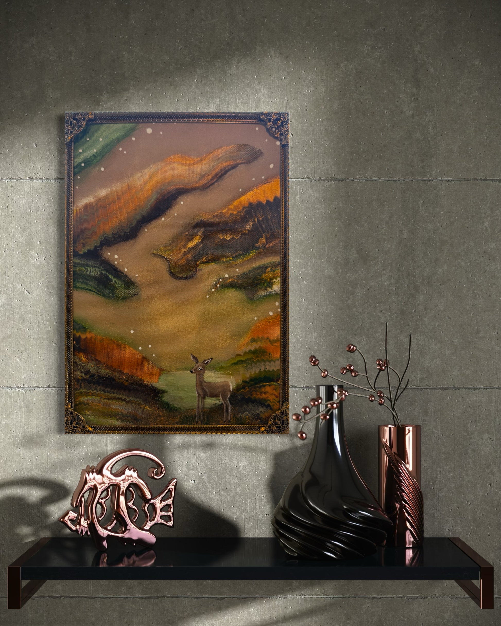 Small original art piece in vintage frame. This is inspired by nature and its way of making spirit feel the calm of a quiet night.