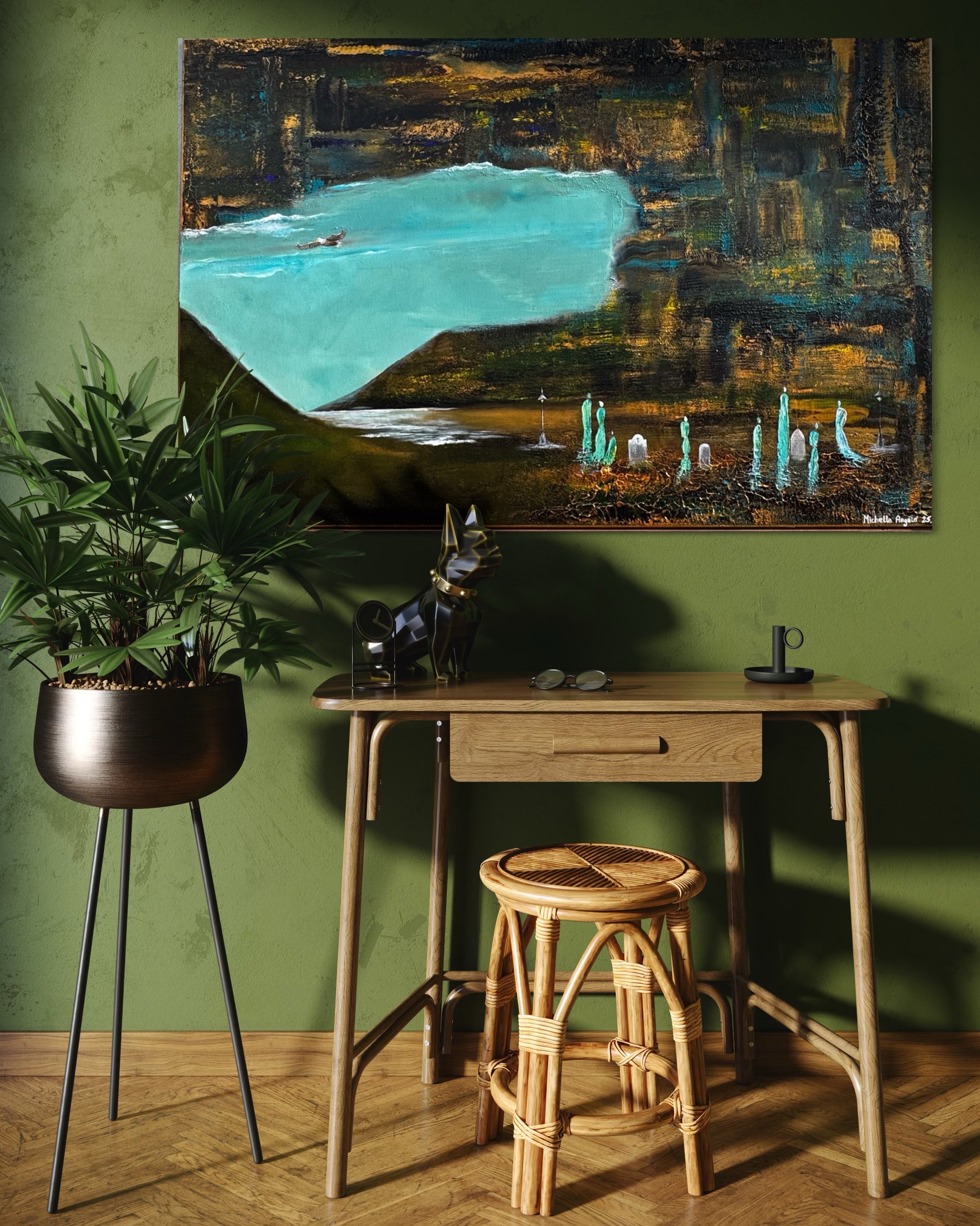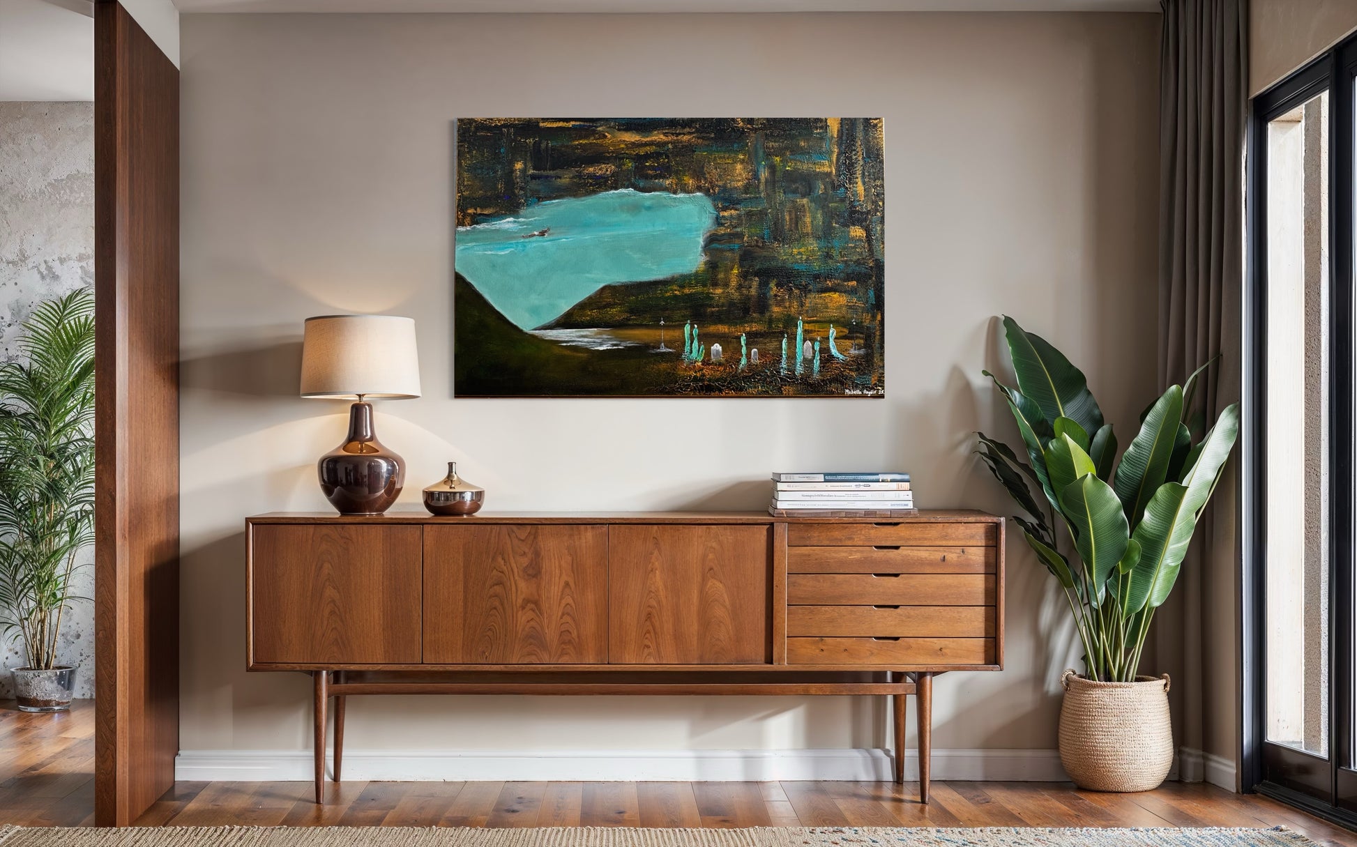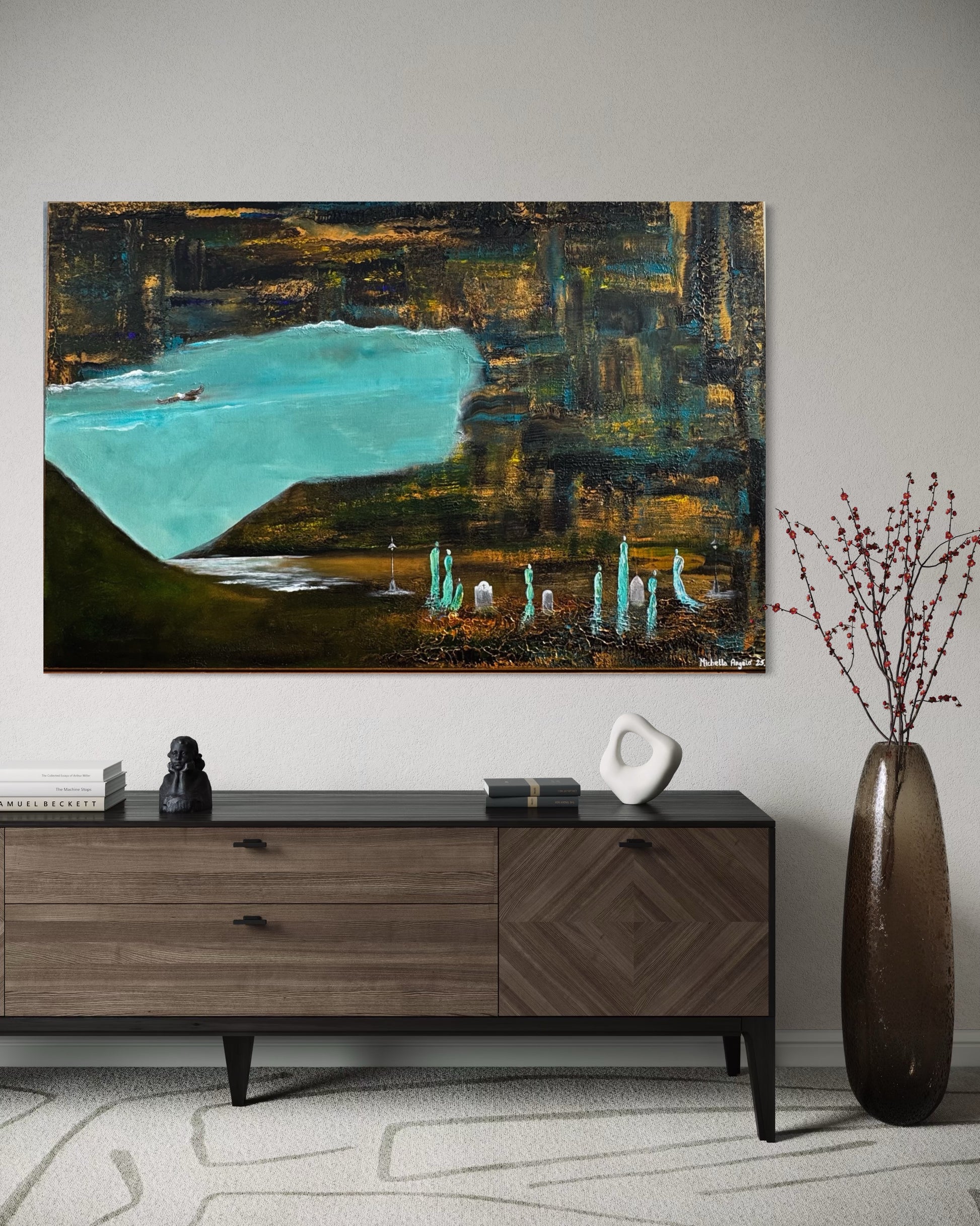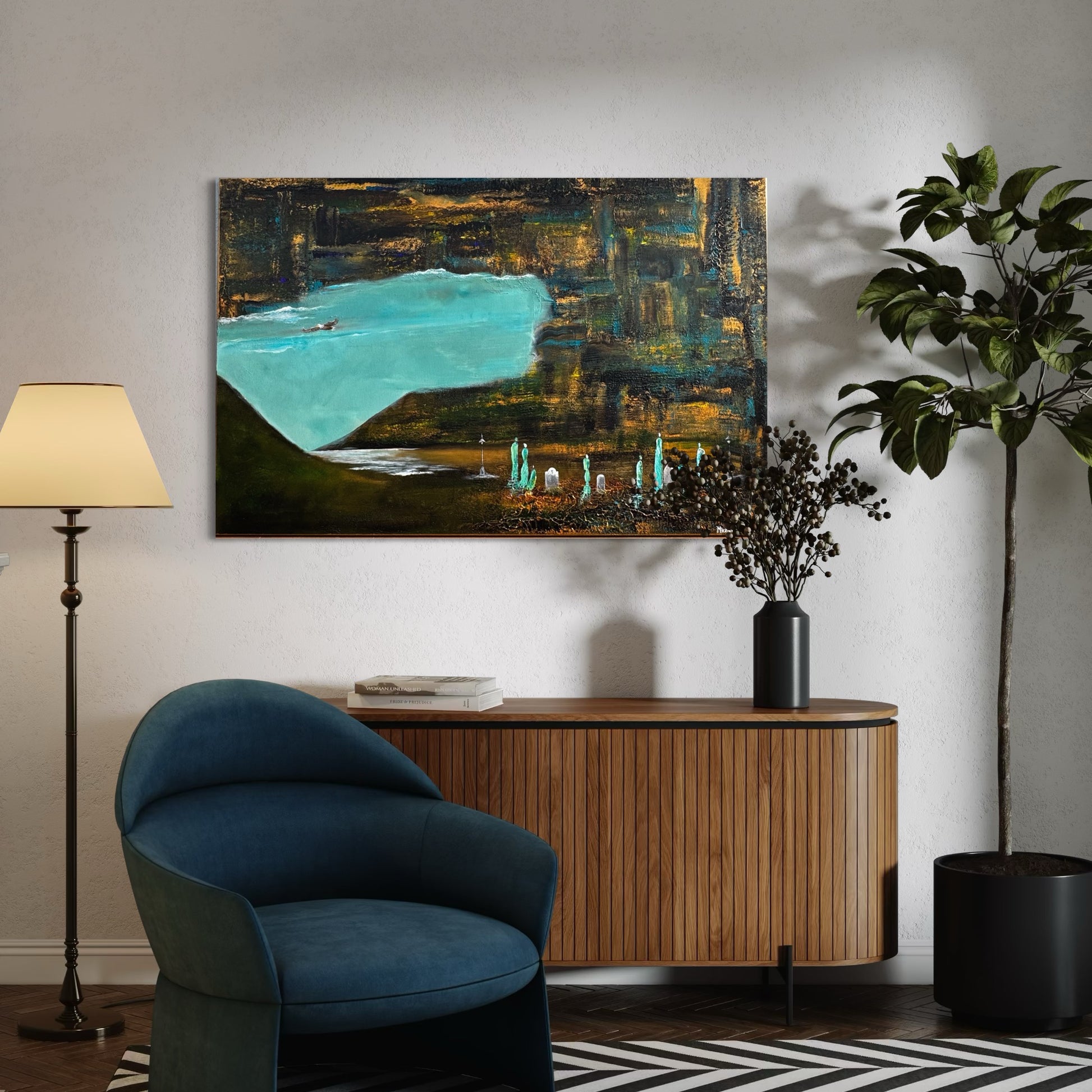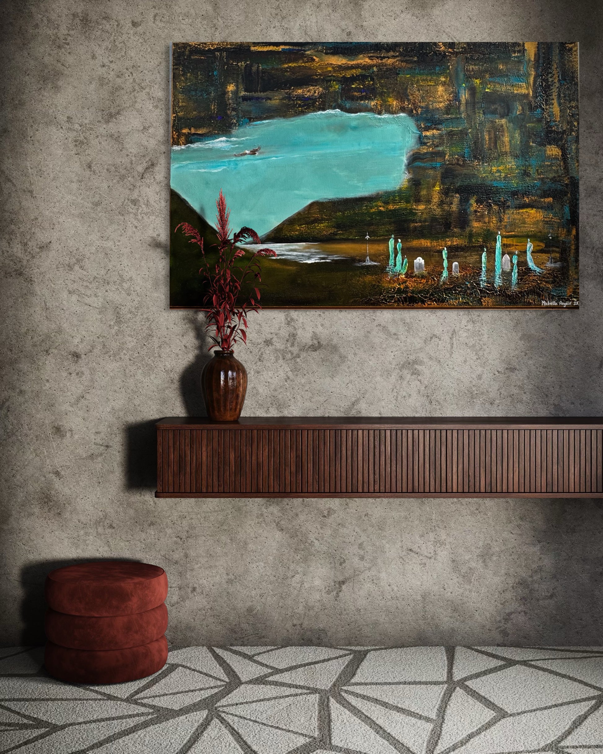This painting reflects the quiet journey of souls -moving through light, memory, and time. The turquoise glow symbolizes hope and reunion, a promise that every ending carries the essence of return. It speaks of connection that endures beyond distance, where presence lingers even after goodbye.