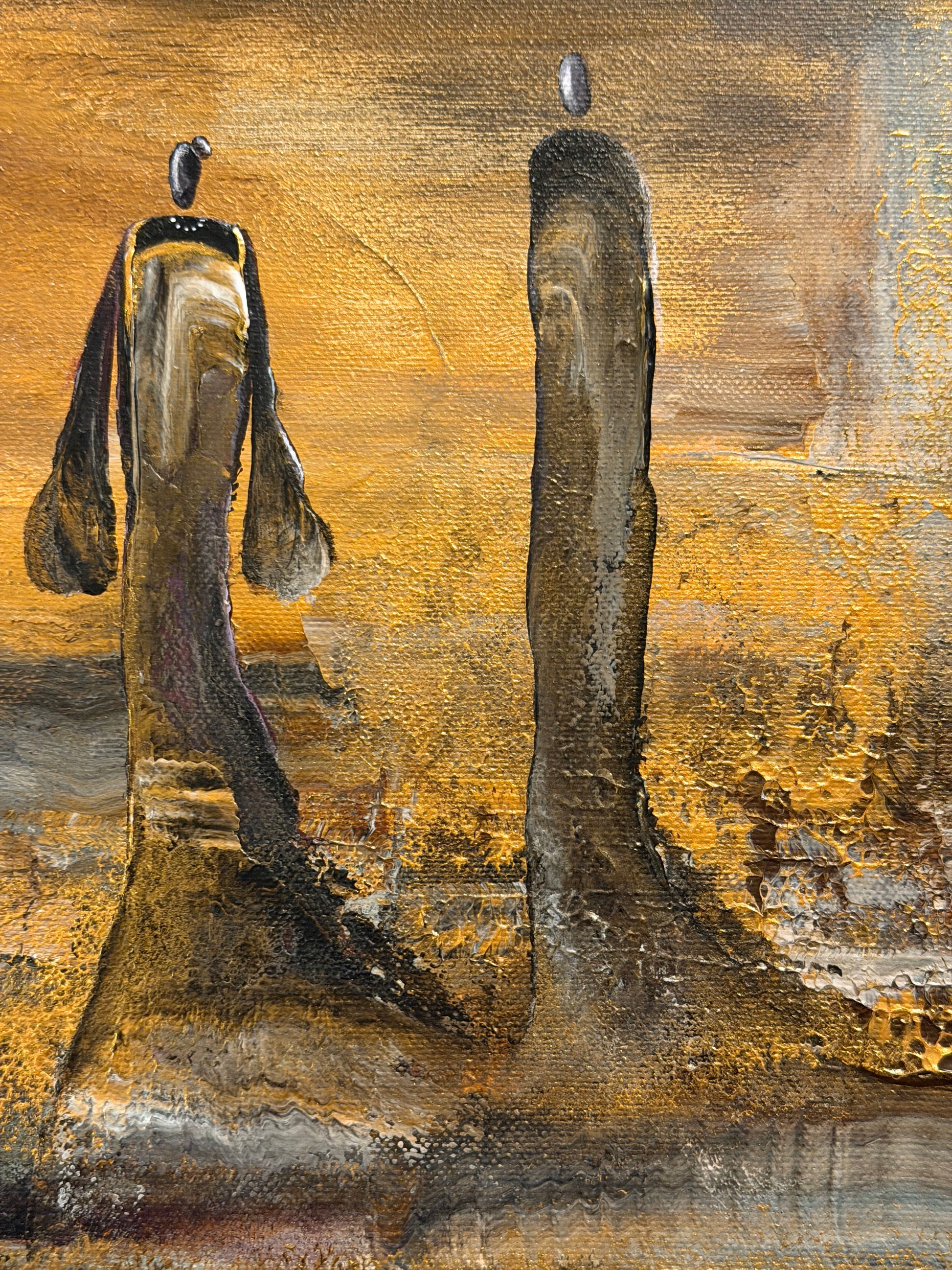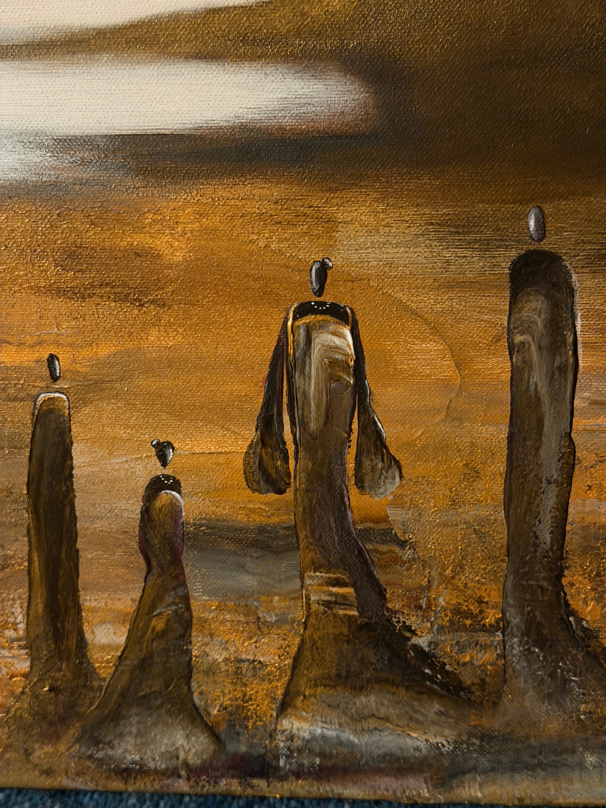 The figures stand close, together as one, moving gently toward the light. Deep blues carry a sense of depth and memory, while warm earth tones bring grounding, safety, and a feeling of home. Soft light flows across the scene as a symbol of hope, continuity, and shared presence.